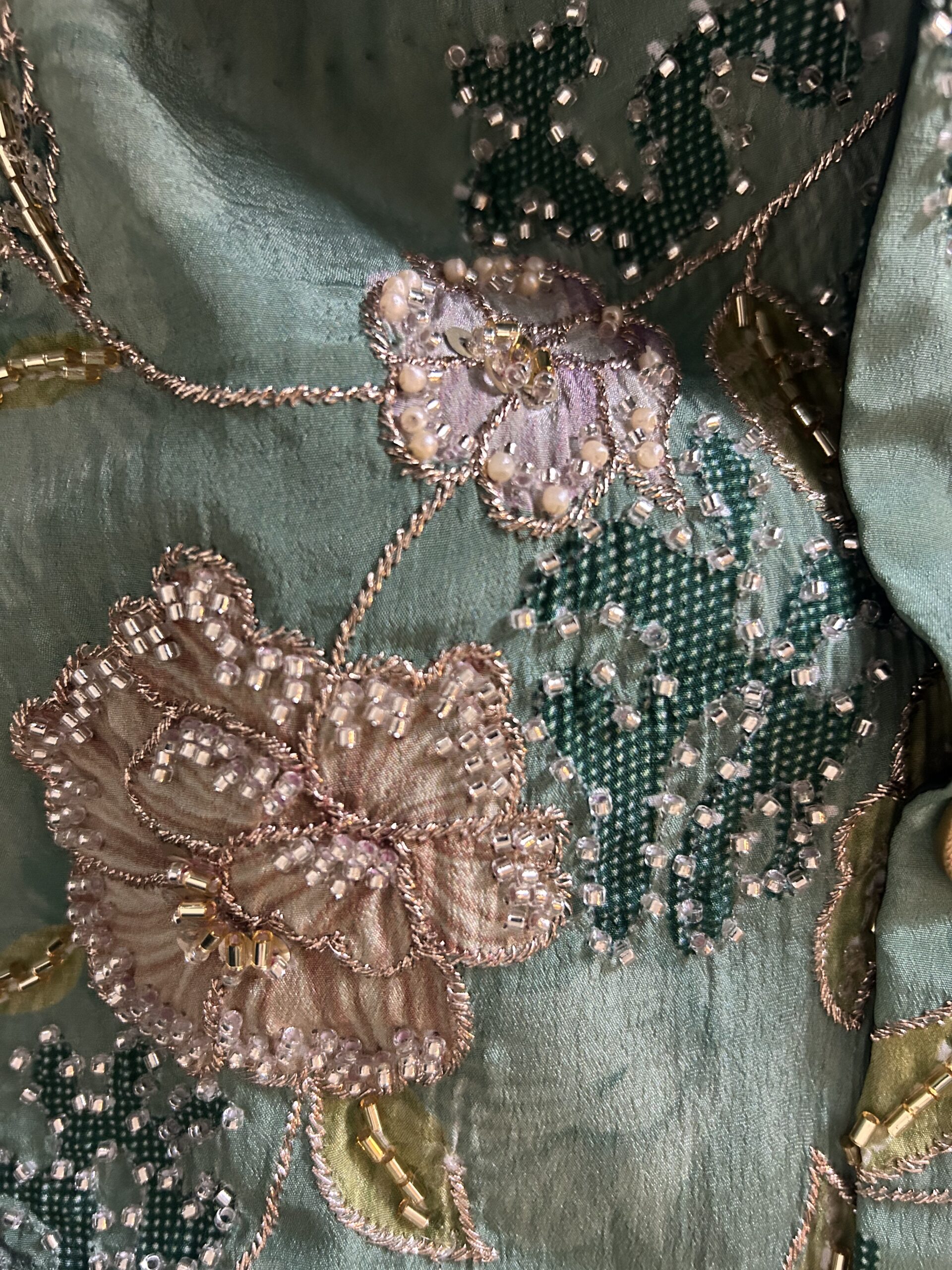 It is paired with tailored crepe satin pants designed with kalis for a flattering, structured fit.