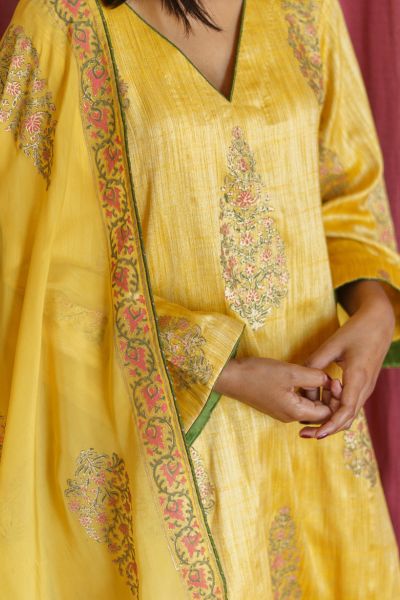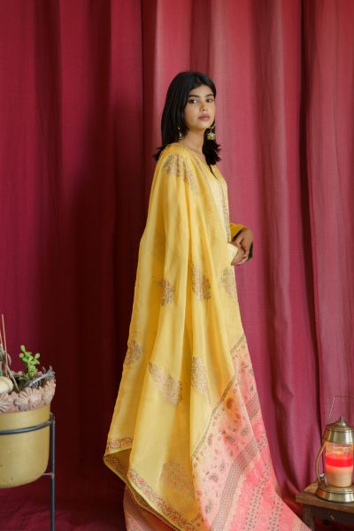 Handwoven cotton silk yellow Farshi salwar kurta set, beautifully hand block printed in our home studio. Paired with an organza dupatta featuring delicate block prints. The set comes fully stitched with soft cotton lining for comfort and an elegant drape