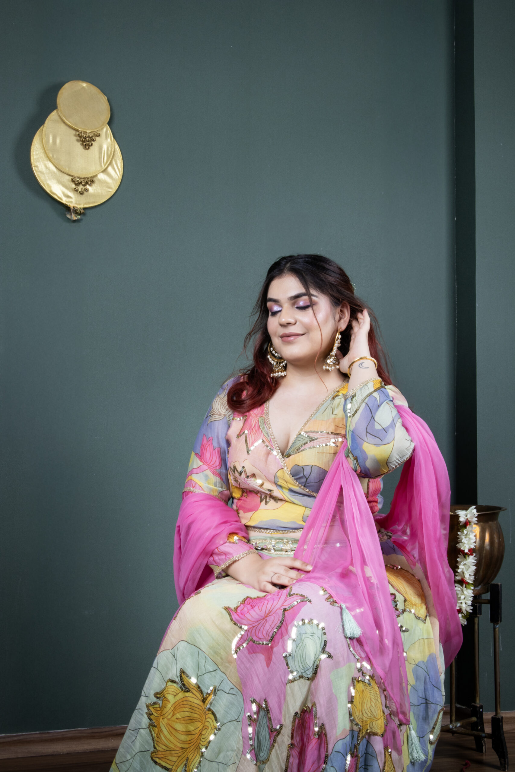 Introducing our luxurious Lehenga Set, designed to make every occasion unforgettable. This exquisite lehenga, adorned with shimmering sequin highlights, is beautifully crafted from rich chanderi silk fabric with a soft taffeta lining and delicate lotus prints. It is paired with a chic wrap-style blouse (without pads) and a graceful chiffon dupatta, adding the perfect touch of elegance to your look.